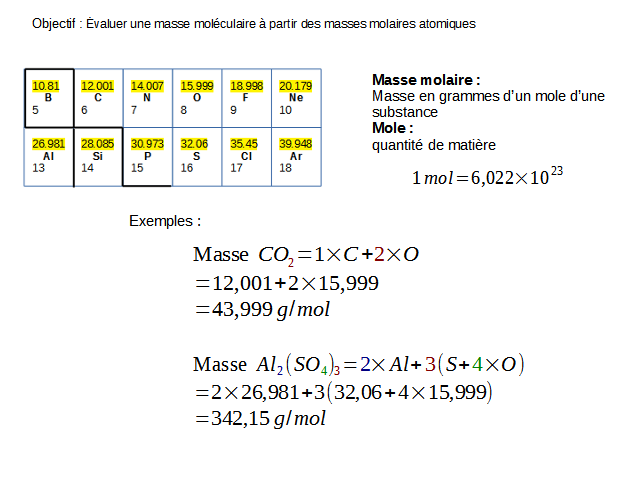 La masse molaire d'un composé se calcule en ajoutant les masses de chaque élément présent dans le composé.