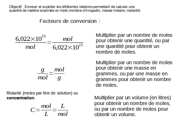 Par exemple, pour obtenir une quantité en moles à partir d'une quantité en grammes, on multiplie cette dernière par l'inverse de sa masse molaire.