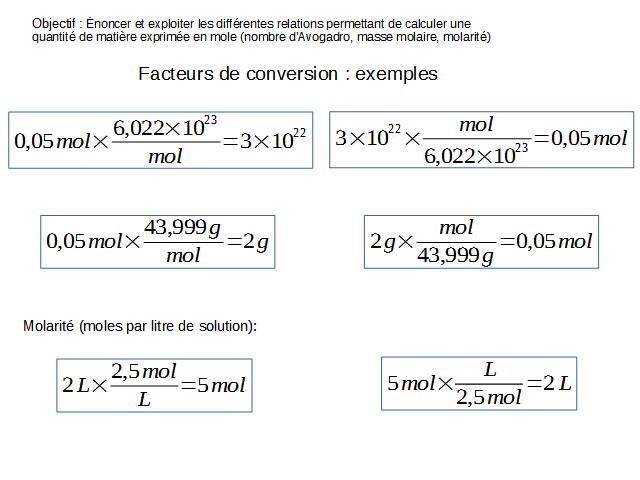 Un facteur est un nombre avec lequel on multiplie un autre nombre. Pour utiliser un facteur de conversion on peut tout d'abord noter l'unité qu'on souhaite dans le résultat, la quantité donnée avec son unité, puis le facteur de conversion de sorte que l'unité désirée soit dans le numérateur et celle qui doit s'annuler dans le dénominateur.