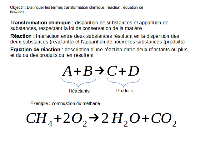 Une réaction chimique est décrite par une équation de réaction. A gauche, les réactants sont les substances qu'on met en réaction. A droite,on écrit les produits obtenus.