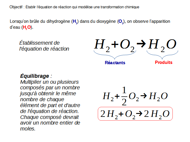 Lorsqu'on écrit une équation de réaction, il est souvent nécessaire de l'équilibrer – c'est à dire faire en sorte qu'il y ait le même nombre de chaque élément de part et d'autre de la flèche. Pour ce faire, on multiplie le facteur devant chaque composé par un entier.