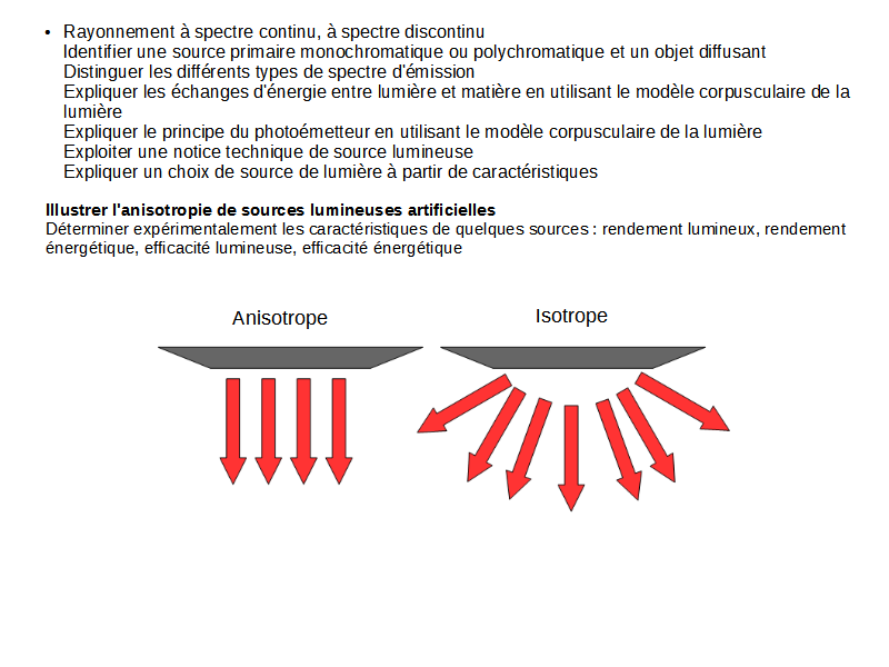 Les sources lumineuses artificielles peuvent être anisotrope (elles n’éclairent que dans une direction) ou isotropes (elles éclairent dans toutes les directions). Une ampoule ou tout corps chauffé éclaire avec la même intensité dans toutes les directions. Un écran, comme celui d’un ordinateur, privilégie une direction.