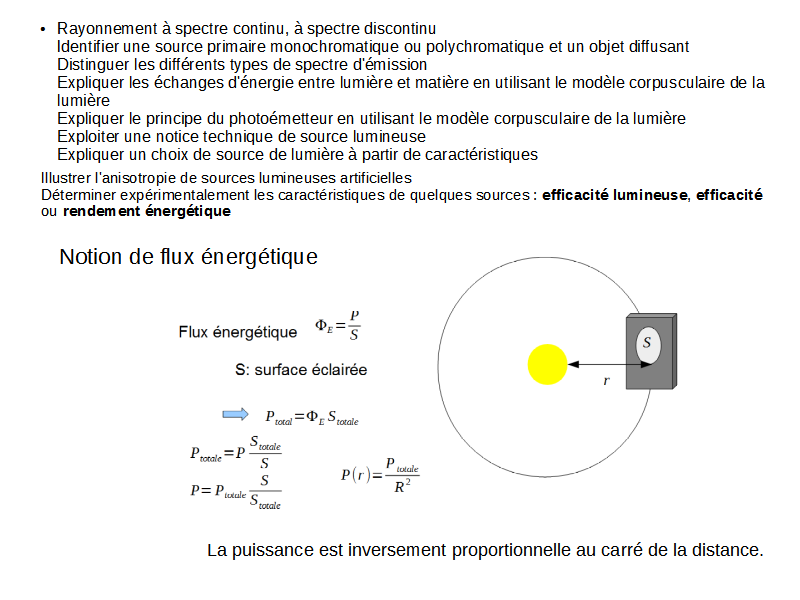 Les quantités physiques liant lumière et énergie au niveau macroscopique sont simples : l’énergie lumineuse, en watts, est répartie dans l’espace en un flux énergétique, en watts par mètre carré. L’énergie se dispersant dans l’espace, le flux énergétique est inversement proportionnel au carré de la distance.