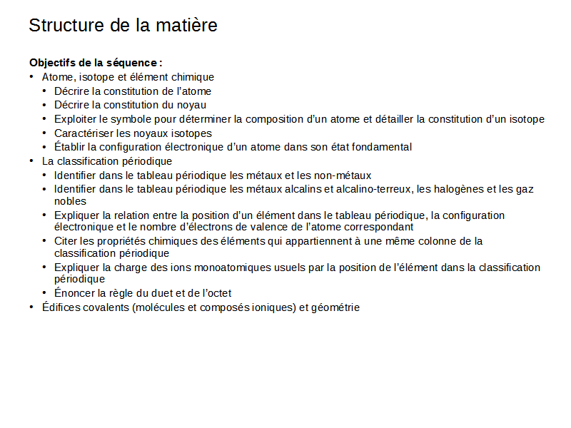 Dans cette séquence, nous allons étudier les différences entre les éléments qui forment la matière. Nous allons voir comment les atomes forment des édifices (sels, molécules), comment on peut les prédire et quelles propriétés les matériaux qu’ils forment peuvent avoir.