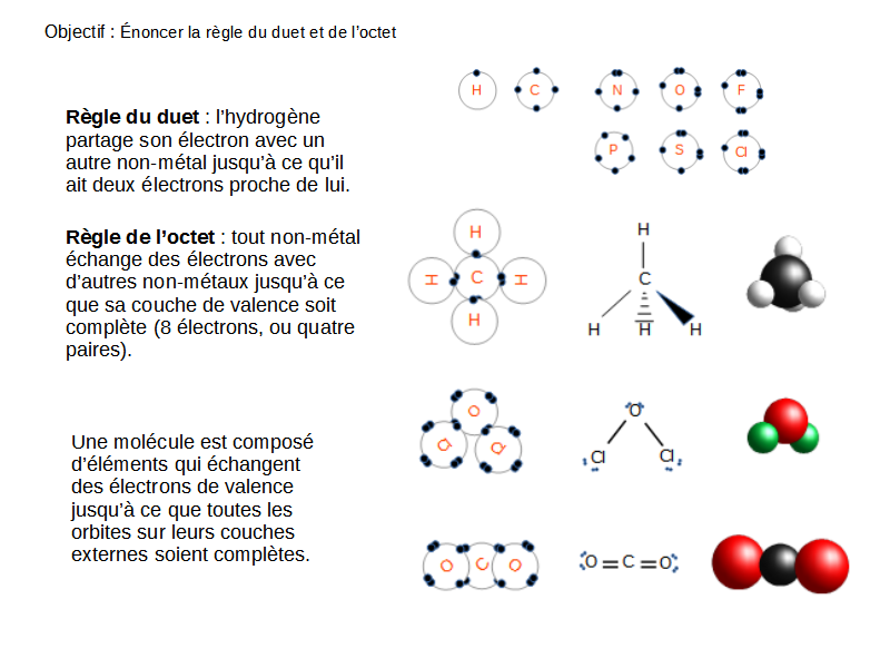Une règle simplifiée (mais avec beaucoup d’exceptions) découle de ce motif : on fait des liaisons jusqu’à ce que chaque élément ait deux électrons proche de lui (hydrogène) ou 8 électrons proche de lui (tous les autres non-métaux).