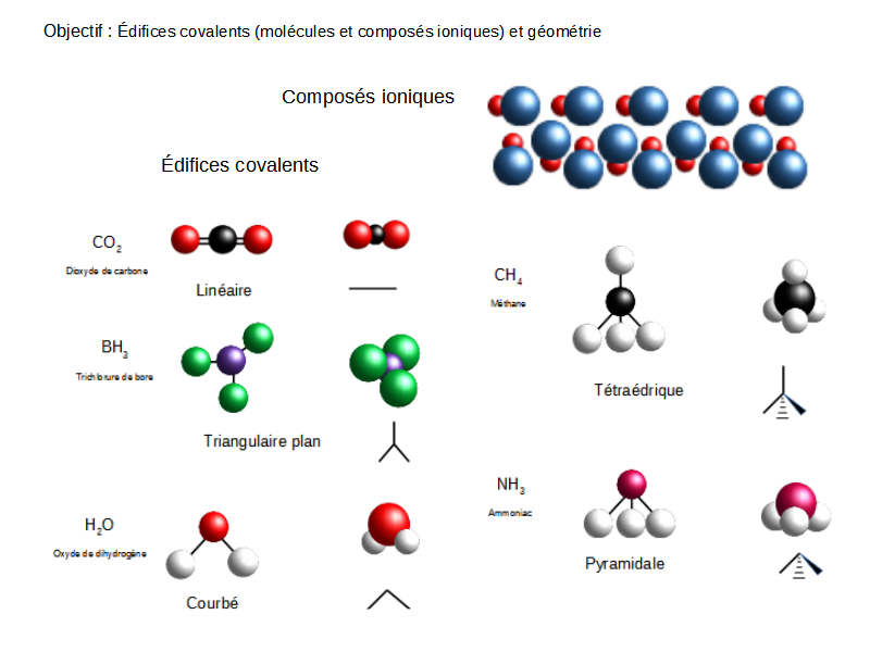 Pour les molécules, leur géométrie peut être compliquée. Elle découle pourtant d’une règle simple : les paires d’électrons autour de chaque éléments se repoussent jusqu’à être le plus loin possible les unes des autres. Il en résulte parfois un moment dipolaire.