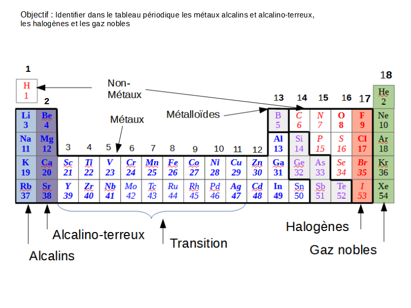 Les métaux sont eux-mêmes divisés en alcalins, alcalino-terreux et métaux de transition. Les premiers ont respectivement 1 et 2 électrons de valence, nombre qui varie pour les métaux de transition.