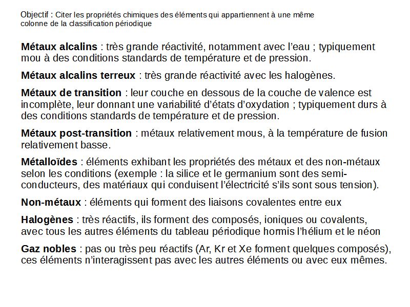 Toutefois, une connaissance générale des propriétés des grandes familles d’éléments permet de comprendre pourquoi certains éléments réagiraient dans certaines conditions plutôt que d’autres.
